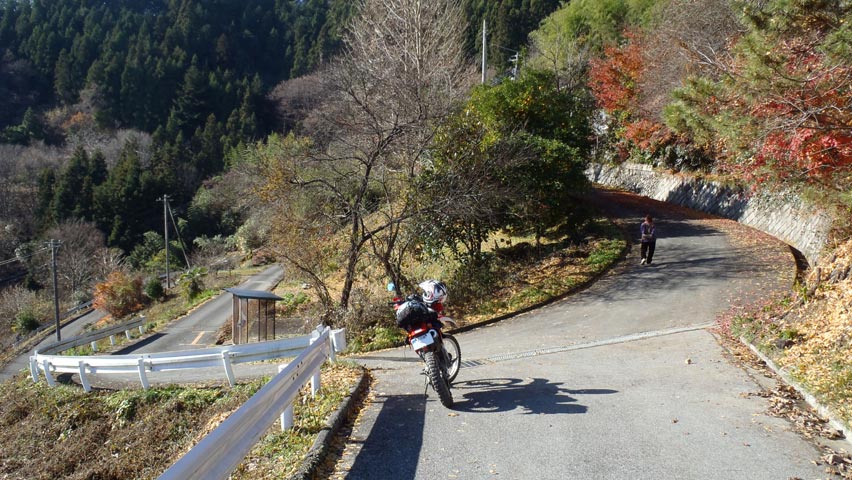 | ピークから100m程下ってくると、道が左右に延びている地点に合流した。んんん?地図を見た感じ、ここは行き止まりだと思っていたんだけど、どっちへ行ったらいいんだろう?そもそも、ここが千鹿谷線の終点ってことでいいのかな? この先、どっちへ進んだらいいものかと、広げた地図を眺めていると、後ろからさっき追い越したおばあさんが追いついてきた(画像右側に写っている方。あの先におばあさんの家があるそうだ)。 こんにちは、と挨拶をすると、「寒いねえ〜」と話しかけてきた。どうやら今朝はこの冬一番の冷え込みとなっていたようで、今行ってきた下の集落ではマイナス7度まで冷え込んでいたようだ。そりゃ寒いわけだよ・・・。「ウチは2度だったけど。あ、2度って家の中でね。」とは言っていたが、それでも2度だよ・・・! ついでに、この先の道がそれぞれどこへ向かっているのかを尋ねてみると、右手はおばあさんの家がある集落となって行き止まり、左手をこのまま下って行けば抜けているらしい。事細かに何処何処に向かって何処何処に抜ける、と教えてくれたのだが、例によって土地勘の無い自分にはさっぱり分からなかった(笑)。でも、そうやって親切に教えてくれる事が嬉しいんだよねえ。別れ際には「寒いから気を付けて」と声を掛けてくれた。こういうところで合う人たちって、みんなホント優しいよなあ。 |