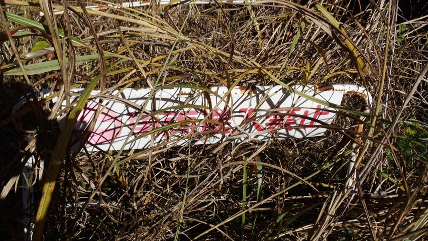 | そんな終点を引き返し、ちょうど道が藪に覆われる少し手前に、起点の看板で見た冬桜があると思わしき場所があったので覗いてみたが、生憎閉鎖されていた。 |