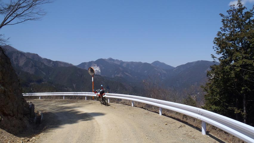途中の路肩で向かいの山が良く見えるところがあったので停車して写真を撮っていると、炭谷入線の方向からバイクの音が聞こえてきた。見ると何台かまとまって走ってきたので、あの集団が通り過ぎてからこっちも走りだそうと思っていると、5台、10台、20台・・・と、いつになってもバイクの列が途切れない。結局、全部で30台以上はいたんじゃないかな、林道であんなに大勢の集団を見たのは初めてだよ、あー怖かった・・・。