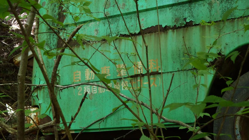 なんと、こんなところにマイクロバスが置いてある。あきらかに不法投棄な感じだが、そんなことより、よくこんな道をこのバスで上ってきたなあ・・・。