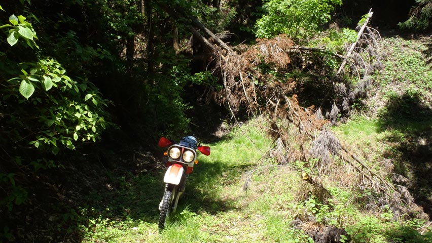 なんて思っていた矢先、ついに道が荒れ始めた。バイクでは通行出来るレベルだが、路面には崩れ落ちた土砂が流れ出てきている。