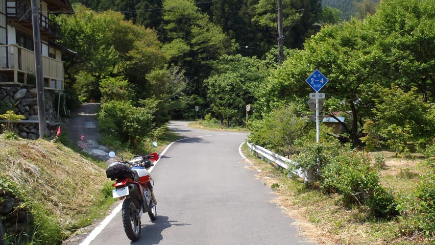その江瀬谷線、どうせ全線舗装だろうと高を括って下ってくると、1.3km程進んできた地点で突然未舗装の路面が姿を現した。おお、やったぜ!こんなところにダート林道が残っているとは!