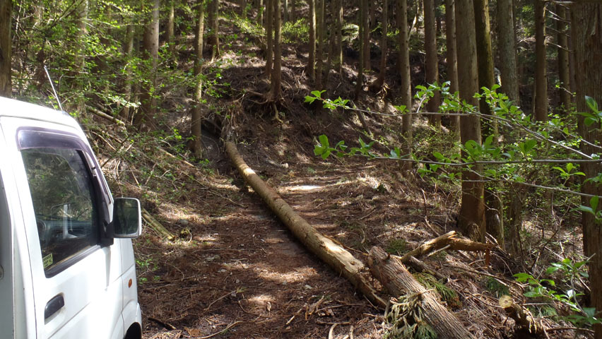 そして、よく見るとその軽トラの前方で一本の倒木が道を塞いでいる。