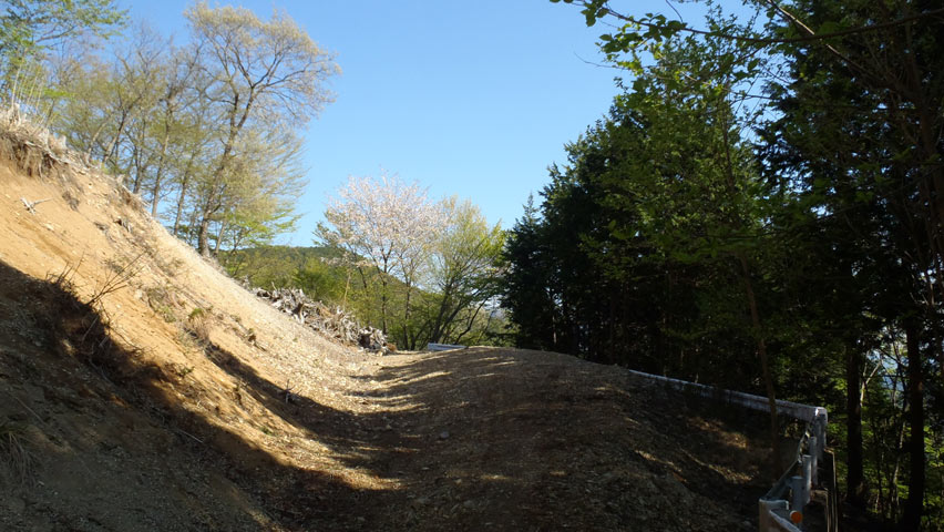 しばらく走ってくると、前回通り抜けが出来なかった地点に着いた。まだ工事は完了していないようだが、あれから法面の施工などもだいぶ進んでいるようだ。そして、右手の斜面に茂る、若葉の芽吹いてきた木々に遮られ、先へと延びる道の見通しは若干遮られている。