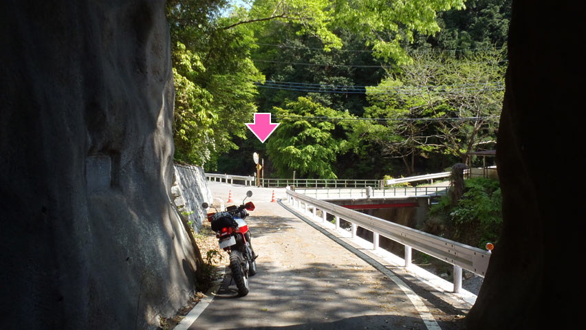 おお、あった!林道茅ノ坂峠線です。ここは、ツーリングマップルにも記載されている林道なのだが、もう何年も前から「舗装化進行中」と書かれていて、そんな状態だから、現在ではもう完全に舗装化されているんじゃないかという思いがあった。