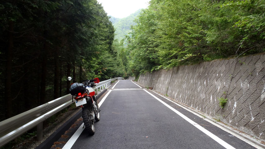 展望広場を後にして、そこから10分程進んだところで、ようやく林道大明神線に到着!大弛峠を出てから、かれこれ1時間40分程も経ったろうか、ここまで本当に長かった・・・。この大明神線、俺の2011年版のツーリングマップルには、まだダートを示すオレンジの破線で記されているのだが、実際は分岐(こちらは終点)からまだ真新しい綺麗なアスファルトで覆われている。ただ、ここが舗装されているというのは確か聞き覚えがあったし、ここまで来た本当の目的地はまだこの先だ。