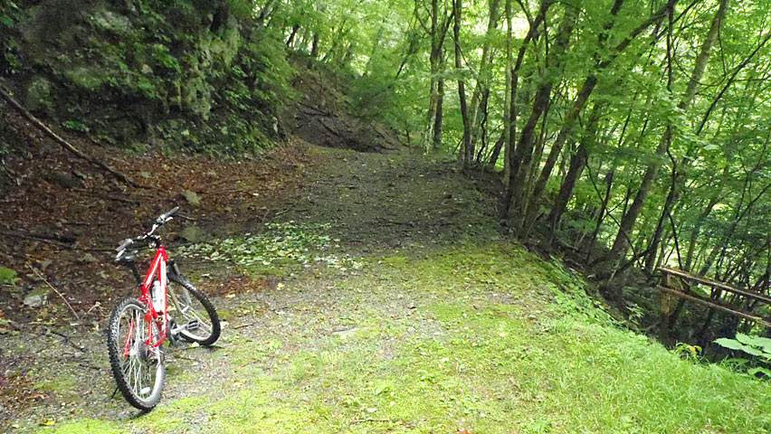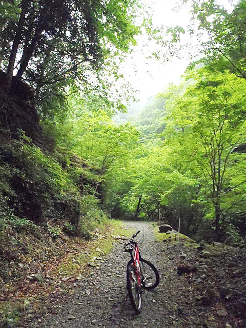 そしてこの東谷林道の路面だが、コンクリートで舗装された区間がたびたび現れる。つまり、それだけ急勾配の区間が多いということに他ならない。先日の奥秩父林道が終始フラットで楽々進んで行けたのに比べ、今日は初っ端から自転車を押しての登りが続き、早くも全身汗だくですよ・・・。