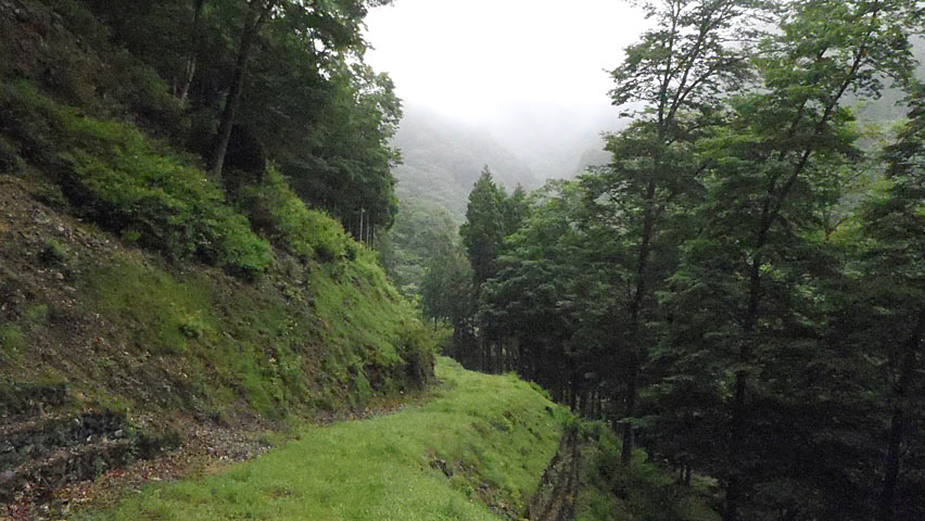 下草に覆われた道は、路面の状態は全くと言っていいほど見えないが、足を踏み入れると大きめの石がゴロゴロと転がっていて、急坂の路面と相まって非常に歩き辛い。しかも、足を踏み出すたびに 露に濡れた草が纏わりつき、既に足元はぐっしょり・・・。
