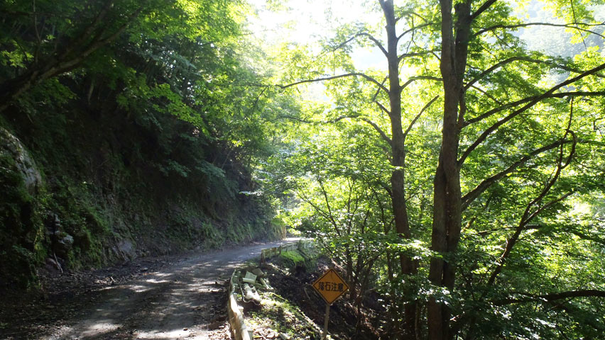 そんなところを気にしつつ(笑)、真夏の中津川林道である!木々の隙間から射す眩しい朝日が苔生した石垣を照らし出す。んー、初っ端から実に爽快な景色だ!