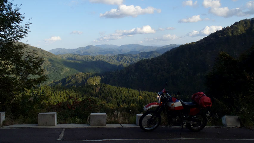 おお・・・言葉を失う程の素晴らしい眺望だ。先ほどの舗装区間から見た眺めも素晴らしかったが、そこから更に標高を上げているため、手前の山の稜線も奥の景色を遮ることなく視界は格段に広い。絶景林道との触れ込みだったのでそれなりに期待はしていたが、まさかここまでとは。この写真で一体何処まで伝わるかは分からないが、この景色の開放感は格別だ。