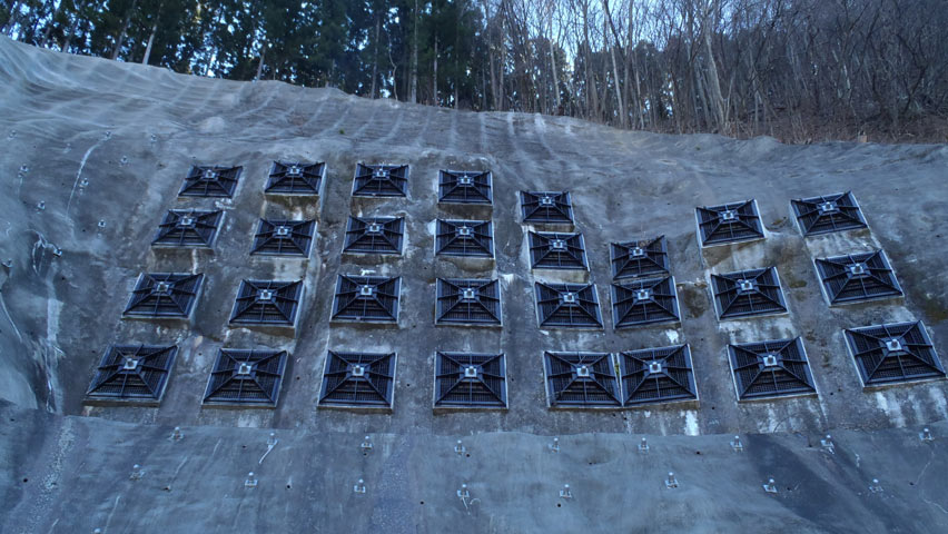 まだ真新しい印象のコンクリートの法面には、巨大なアンカーが幾つも打ち込んである。確かにこれだけ高い崖が崩れようものなら、後々の復旧も大変そうだし、事前にこれだけ強固に造っておくのが正解な気はする。