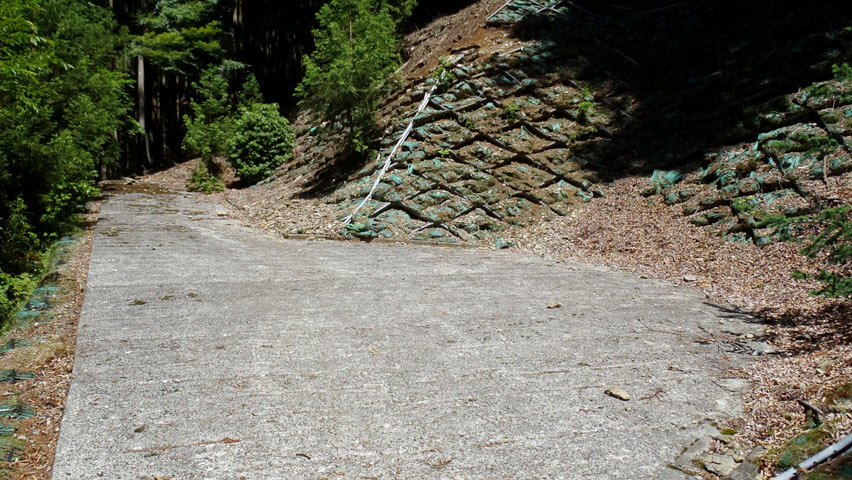 webで検索すると、このナメ沢林道の設計と施工についての資料を見ることが出来るのだが、それによるとこのナメ沢林道は、この林地の平均勾配が30〜40度という急傾斜であり、且つ周囲が国立公園内であることや国道沿いの立地であることを鑑み、環境・景観面への配慮、また建設費用の経済性などからこれだけの急勾配での設計となったという。ちなみにこの路線中の最急勾配は、何と24.9%(!)にも及ぶというから驚きだ。