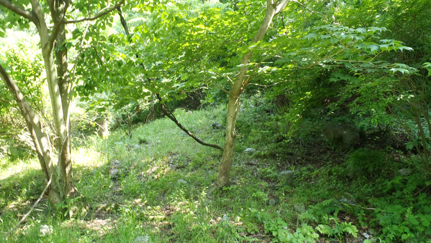 その平場に降りて歩いてみる。かつてアズサズ線が現役だった頃には、もしかすると資材置き場など何らかの目的のために利用されていた場所だったかも知れないが、そういった人工的に拓かれたという証拠になるようなものは見当たらなかった。上の画像の奥で、右手に道のような地形が延びているようにも見えるが、確認したところ単に斜面から流れてきた土砂が堆積しただけのようだった。