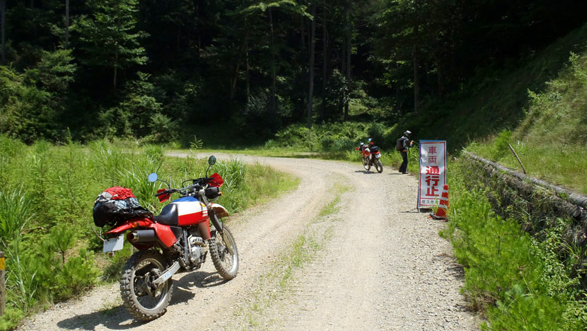 しばらく進むと、路肩に通行止めの看板が立ててある。バリケードの類は設置されてはいないが、んー、去年こんなのあったかなあ?