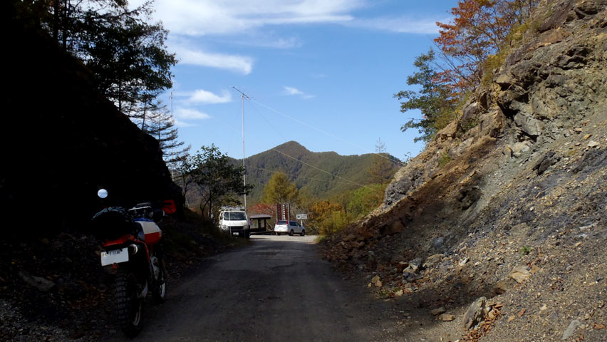 峠の切り通しから長野側を見ると、何やらライトバンの脇に大きなアンテナを立てているのが見える。そういえばあの左手に延びている道の先が、確かNTTの基地局だかがあったはずだが、それに関係した作業でもしているのか?眺め的にはちょっと邪魔だけどなー(笑)。
