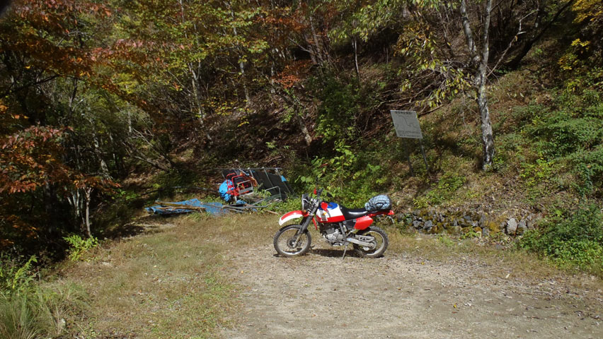 やがて、道の上にバリケードがひとつ置かれた地点に着いた。この大丹波線、この先で土砂崩落地点があり道が寸断されてしまっている。このバリケードはそれを知らせる為のもので、前回来た時もここに置かれていたのだが、以前とは異なり注意書きも無く、道幅いっぱいに置かれていたバリケードもたった一つになり、そのまま車両も通行出来るだけの幅が確保されている。もしかして、あの崩落は既に修復されたのか?