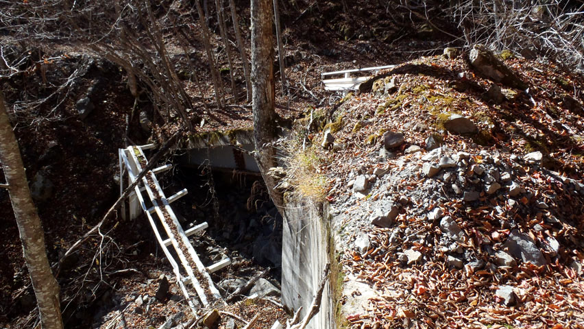 その洗い越しに水を注ぐ水路を見ると、今日は水が枯れているようだが、その表面に開いた穴は、前回見たときよりも格段に大きくなり、コンクリートの下の土も洗い流されてしまったのか、上の方では底面が陥没しているようだ。たった1年半の間にこれだけの変化が起こるのは、やはり近年頻発するゲリラ豪雨の影響なのだろうか。