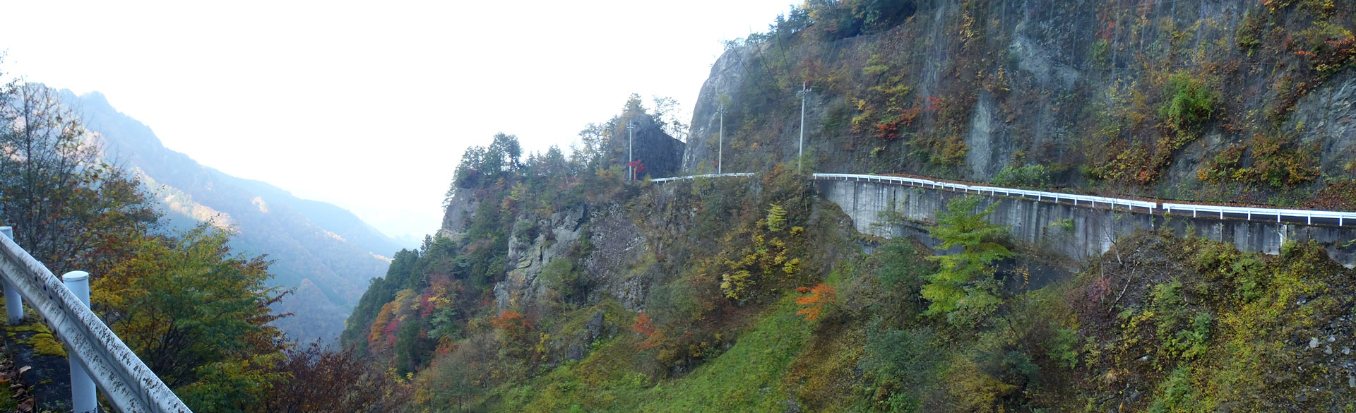 暗いなりに何とか撮ってパノラマにしてみた。ところどころ葉が色づいてはいるけれど、やはりここからの景色は陽当たりのいいときに見るのがいいな。
