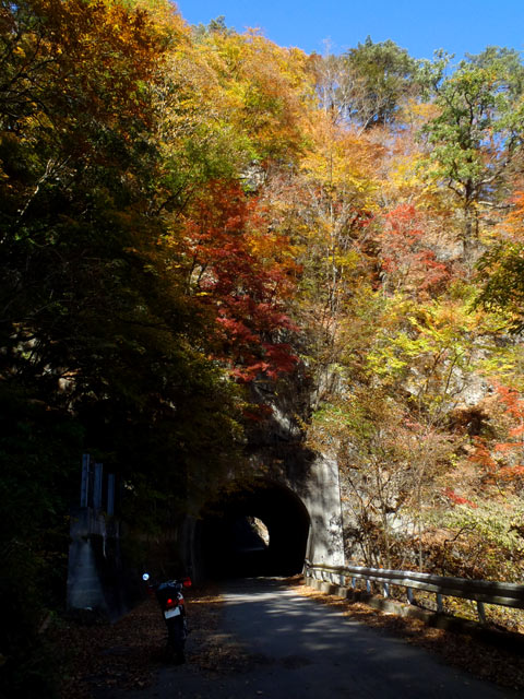 おお、これは良い!朝日に照らされた紅葉と、その下で影となるトンネルのコントラストが実に綺麗だ。