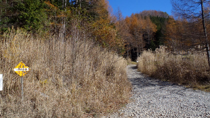 そうか、以前来た時は気にも留めなかったのだが、この周辺ってカラマツ林になっていたのか。今まで栗原川に来た時はいつも緑のある季節だったのだが、秋に来るとこんなにも見事な景色へと変わるんだな。先日中津川林道へ行ったときには三国峠で折り返してしまったのだが、峠から川上村のカラマツを見て、あの中を走りたいと思ったことが、まさかここで叶えられるとは思わなかった。