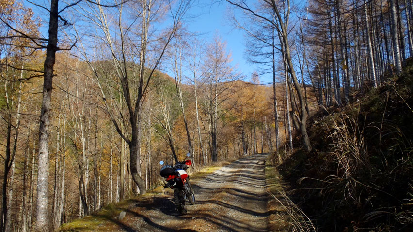 それにしても、この晩秋の林道の美しさよ。路上を斑に埋めるカラマツの落ち葉と、そこに落ちる冬枯れた幹のシルエットが描くストライプ。それでもここは、まだ今日の真の目的地にも至っていないのだ。そもそもトータルで50kmに及ぶロングダートに来ている訳で、序盤からこんなにウットリしているといたずらに時間が過ぎてしまいそうなので、ちょっと今日は急ぎ足で進むとしよう。