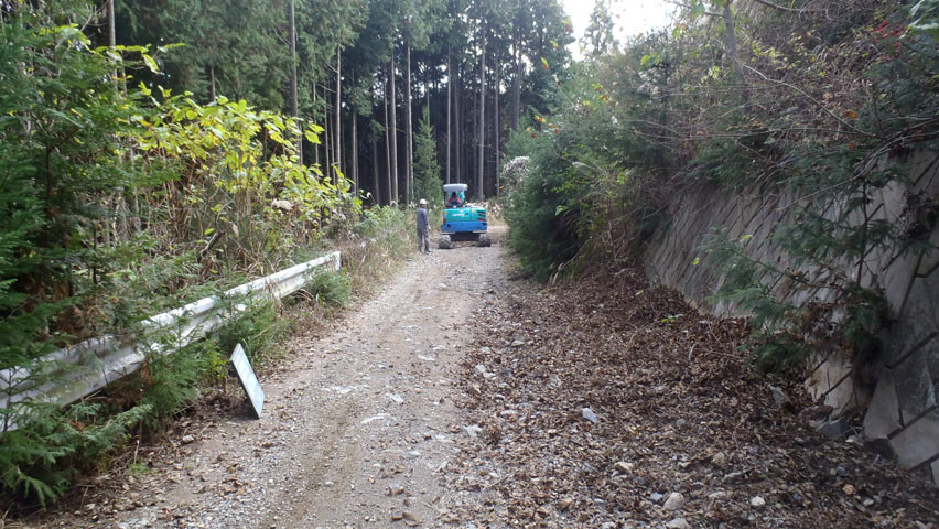 見たところ、単に荒れた路面の補修工事のようだ。さすがにいきなりこんな地点だけ舗装することは無いだろう。とはいえ、この大名栗線自体はいずれ全線に渡っての舗装化も既に視野には入っているんだろうけど。
