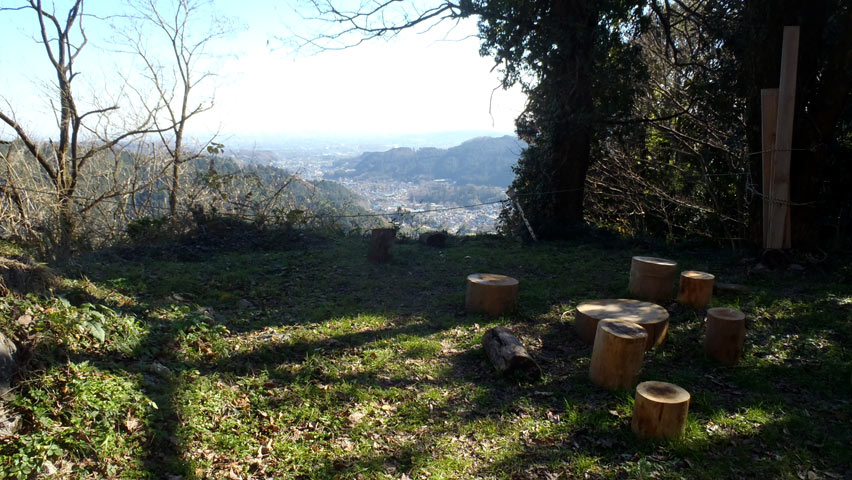 山頂を引き返し、桜の枝の下から分岐する、展望台へと続く道を進もう。