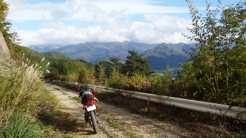 相木川上線の未舗装区間に入って程なく、道の外に視界の開ける地点がある。うおおおお!なんだここは!あれだけ巨大な送電線の鉄塔が、まるでミニチュアのように見えてしまうこの雄大な山々!んんん、素晴らしすぎる!そういえばここは以前逆方向から通った時にも目にしてはいるのだが、あの時は生憎の曇り空だった。それはそれで良い景色だったけど、今日の眺めは青空の下、山肌に雲の影が斑に落ちるという、俺の大好きなシチュエーション!久し振りに来た林道ツーリングで、こんな景色が見られるなんてもう最高ですわ!!