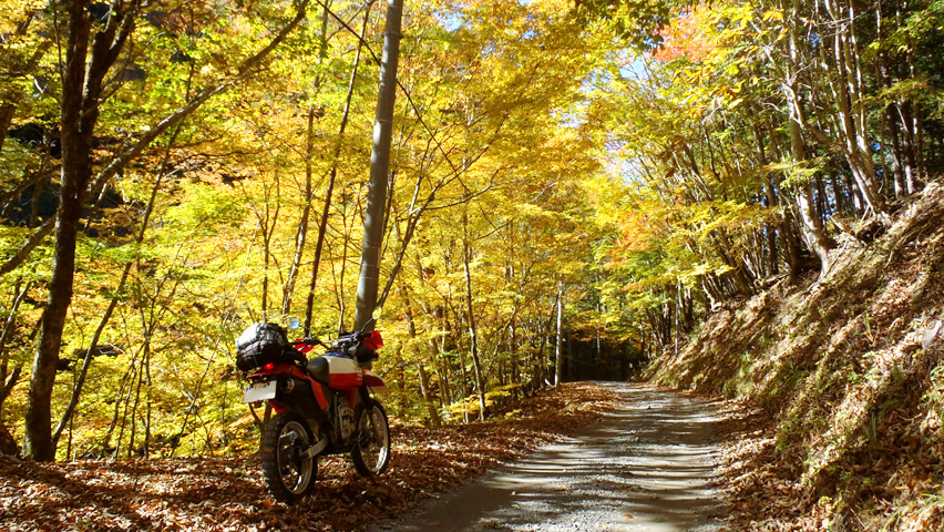 色付いた木々の葉を通過した、柔らかな陽射しに照らされた嘗ての路盤を、落ち葉をさくさくと踏み締めながら歩いて進む。