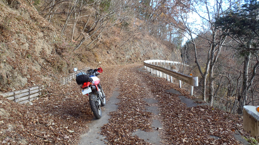 昼飯を終えて再び走り出すと、舗装の路面の上にたっぷりの落ち葉が積もる地点があった。舗装区間でも、何でここだけこんなに?でも、この見た目は嫌いじゃないぞ。