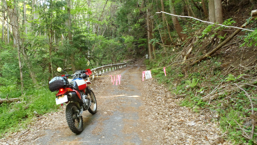 さて、崩落地点を観察してみると、路肩にはバイク1台なら通れそうな幅が残ってはいるが、途中でその上に倒木が覆い被さり、触ってみたが人力ではびくともしない。うっかりアレにタイヤでも引っ掛けようものなら、間違いなく谷底行きだな・・・。