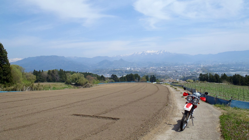 途中で標高を上げる方向へ延びる道を見つけて入り込むと、やがて畑の中に迷い込んでしまった。左手の畑の中では農作業をしている人もいたが、こんなところへバイクで来るなんて一体何をしてるんだろうって思っただろうな・・・。