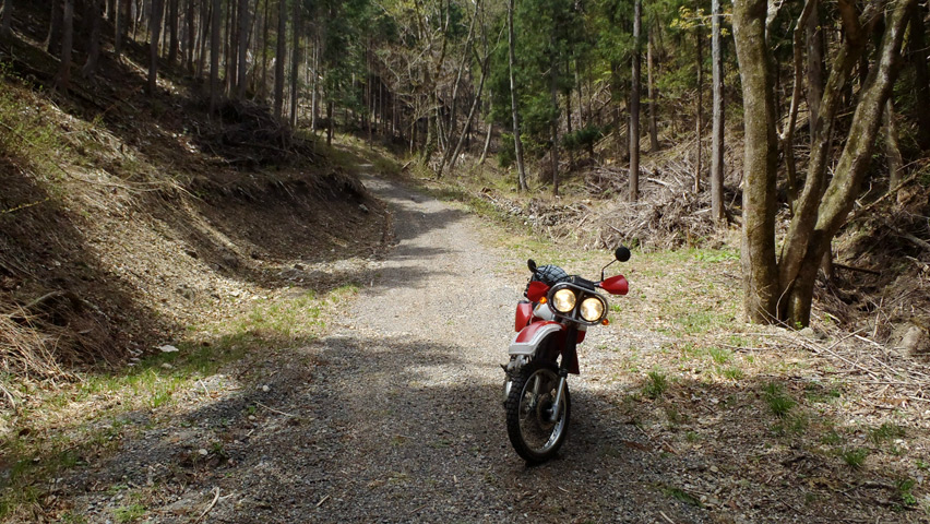 やがて、道の勾配も穏やかになり、先程までの杉林から一転、芽吹いたばかりの広葉樹に囲まれた区間となった。おお、この雰囲気は凄く好きだぞ。実に林道らしい林道といった趣だ。