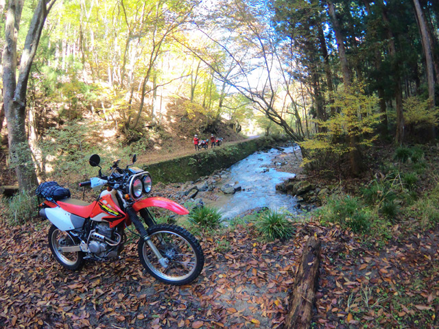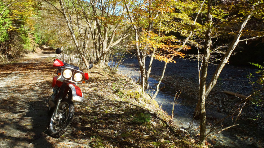 と、そんな道をしばらく進むと、突如洗い越しが現れた!うおおおお!林道の洗い越し、ちょっと前から見たくて仕方なかったやつや!これはテンション上がるぜえ!!この写真では分かりづらいとは思うが、思わず水の流れの真ん中にBAJAを停めて撮ってやったぜ!