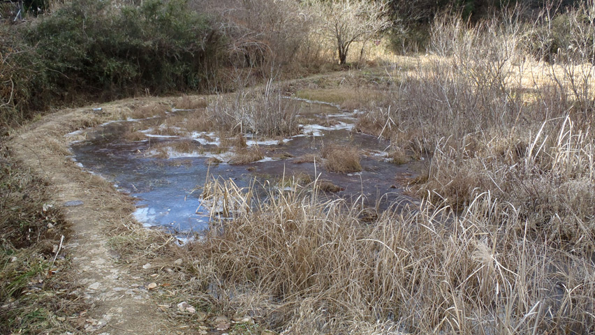 その起点の前にBAJAを停め、少々もよおして来たので、横沢入の入り口にあるトイレまで来てみると、その建物の裏手にある池は、一日中陽が射すことが無いのか、その一面を氷に覆われていた。
