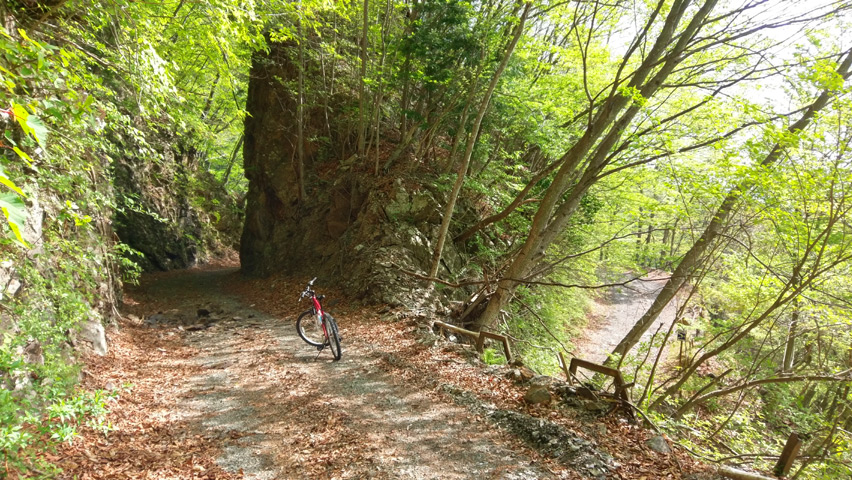 熊取林業専用道の探索を終えて、仙元林道まで引き返す。せっかくの楽しい下り走行なので一気に下って行きたいところだが、やはりこの切通しではどうしても足を止めてしまう。