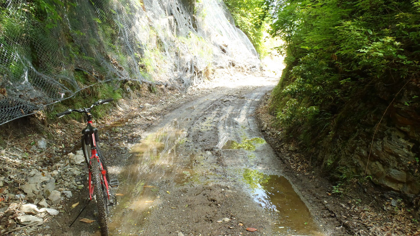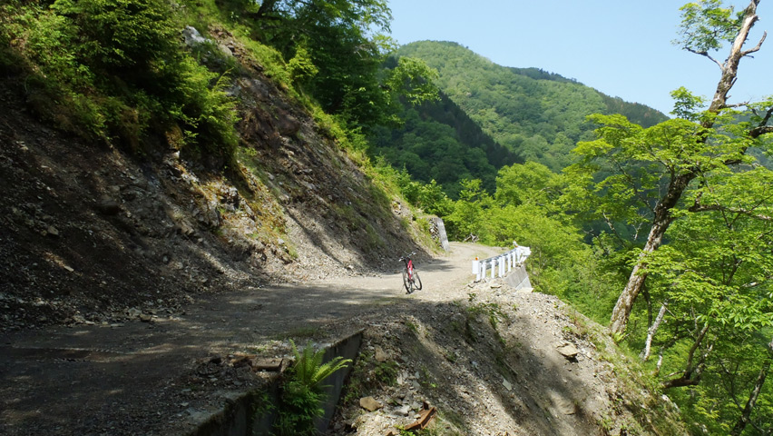 実はここ、今では何事も無かったかのように綺麗に復旧しているが、9年前に来たときに、崩落によって路盤が流失していた場所だ。ただその時は、山側に人が通るには問題ない程度の僅かな路盤が残っていたので、構わず進んでいったのだが、ここを境に自転車の通行が困難な程に路面が荒れ始め、その先に再び現れた崩落によってそれ以上の進行を断念していた。