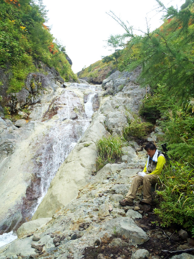 現在の標高、約1,700m。登山道を外れ毒水沢を辿ることおよそ1時間40分を経て、遂に香草温泉に到達した!