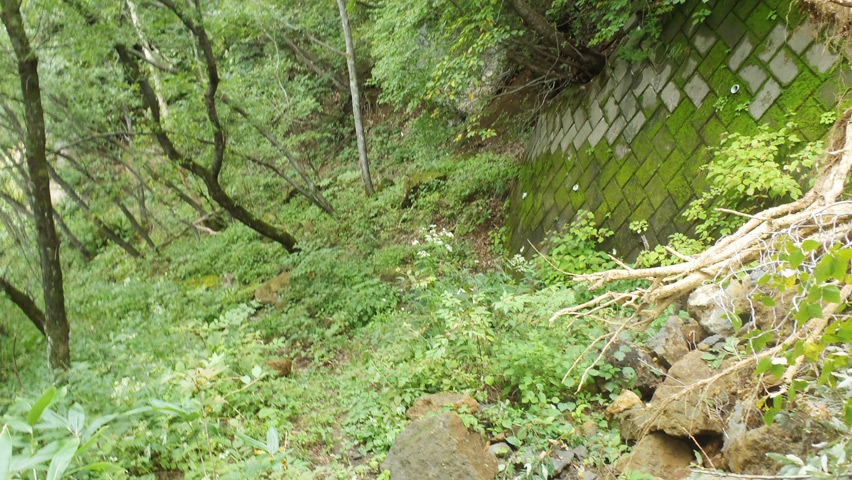 更にその先では、崩れ落ちた土砂に加え、路面自体を崩落によって消失している場所もあった。登山道での洗掘を見たときに、この溝を流れた水が1箇所に溜まり、路面を崩してしまっているかも知れないと思ったが、予想したとおりの地点がこんなに早く現れるとは思わなかった。林道おたく的にはこの先を進んでみたいと思う気持ちも無くは無いが、この先の状態が読めない以上深追いは禁物だ。このまま大人しく登山道を下って帰ろう。