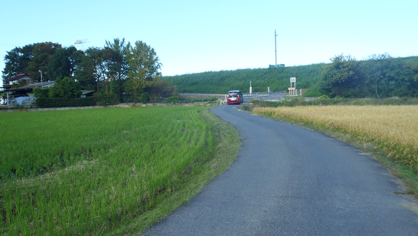 田圃の間を抜けてきた道は、奥に見えている堤防の脇を流れる小さな川に掛かる、これまた小さな橋を渡った地点で直角(!)に折れて、堤防の上へと向かっている。