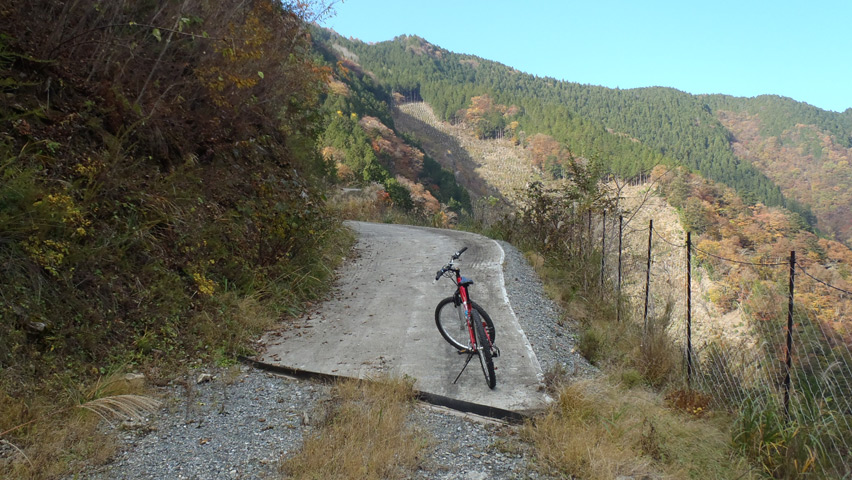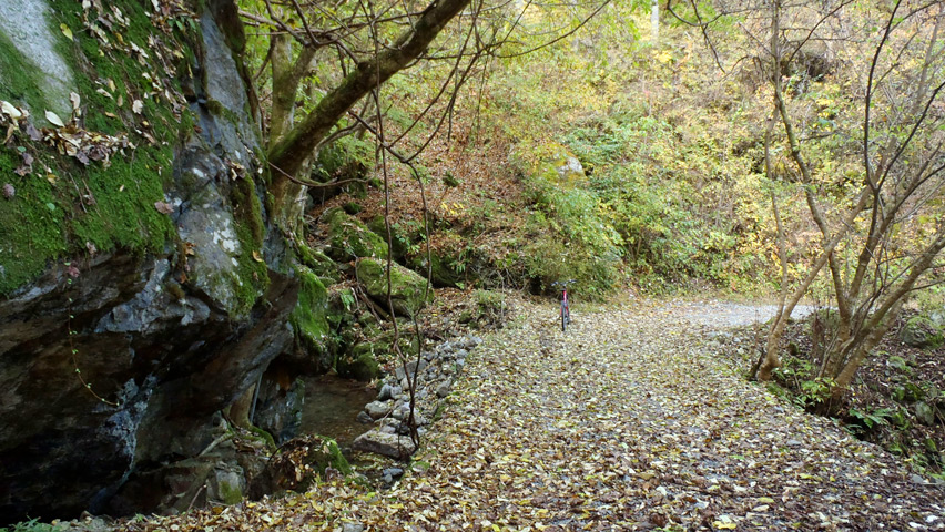 しかも、そこそこ長い距離を舗装してある。ここ、勾配も緩いし洗掘の心配もそれほどなさそうだけど、何か舗装をしなければならない理由があったのかな?まあ、チャリで通る分には走りやすいけど。