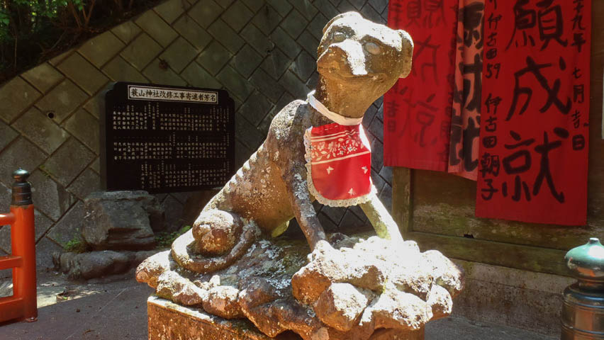 先端に向かって広がった吻部の造形のせいか、やや洋犬のような印象を受ける頭部。台座には奉納された日付などは見つけられなかったが、いつ頃造られたものなのだろう?
