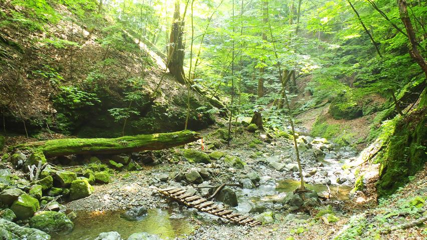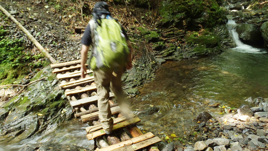 滝を後にして再び進もう。この先で沢を渡る地点には、人が渡るにはじゅうぶんな橋が掛けられていた。実は、だいぶ以前に、途中で渡渉しなければならない場所がある、といったような情報を見たこともあったので、途中で靴を脱いで入水することも覚悟して来たのだが、結果として最後までその必要は無かった。
