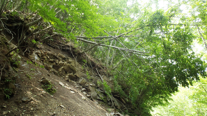 そこから先は、いよいよ完全な徒歩道となるが、ここは過去に斜面が崩落したような地形になっている。