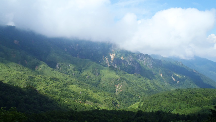 そして、路肩の開けた地点からは、雲の隙間から射す日光に照らされた、麓に向けて続く山肌がくっきりと見えている。おお、この雲の多さも、山肌を照らす陽の光とその向こうの青空のおかげで、かなり素敵な眺めになっている。この山岳林道の趣き、最高じゃないか!