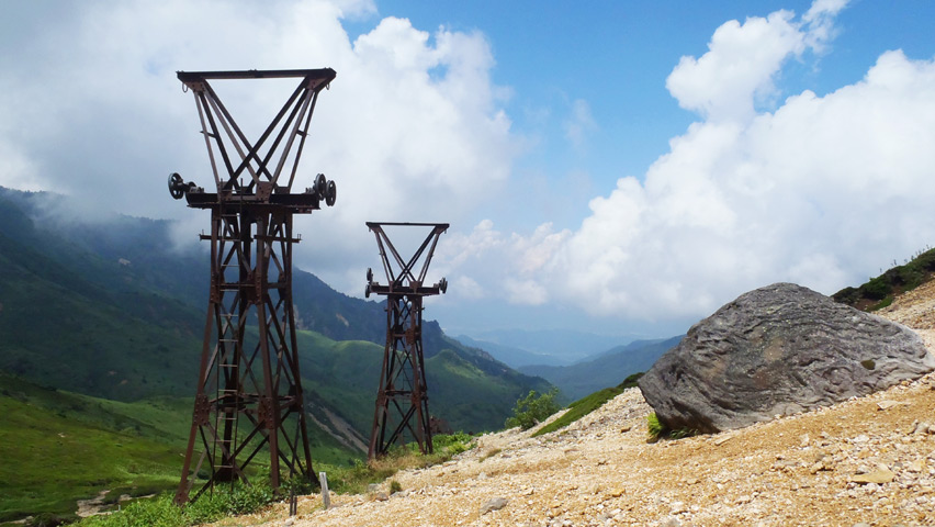 飯を済ませ、ここに来たら恒例の、この鉄塔の写真を撮っていこうと思い斜面を登って来た。かつてこの地で営まれていた硫黄鉱山集落を、閉山となった今も静かに見守るように立ち続けるこの鉄塔群が大好きなのだ。