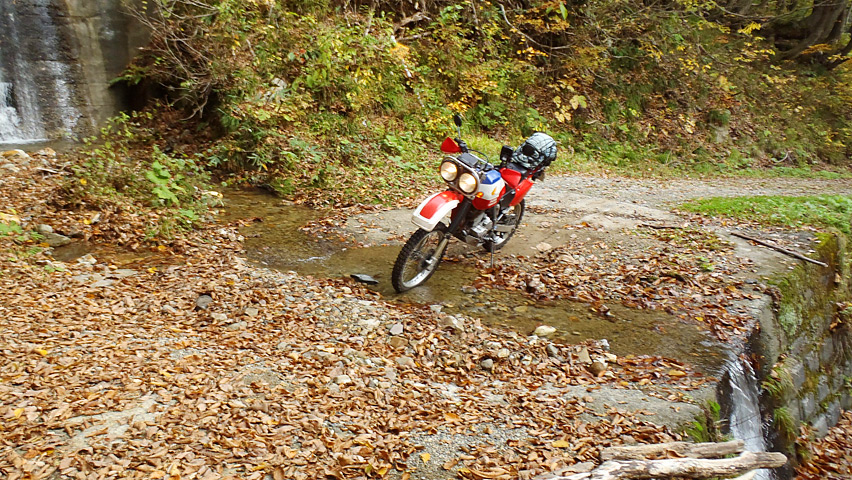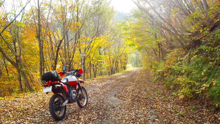 林道の入り口からここまで、およそ4.4km。それほど長い距離では無かったが、それでも前回入れなかった林道をようやく走ることが出来て、しかもそれがこんなに美しい紅葉の中と言うこともあってとても満足した気持ちになった。全線通り抜けることが出来れば最高だっただろうが、まあそれは言うまい(笑)。
