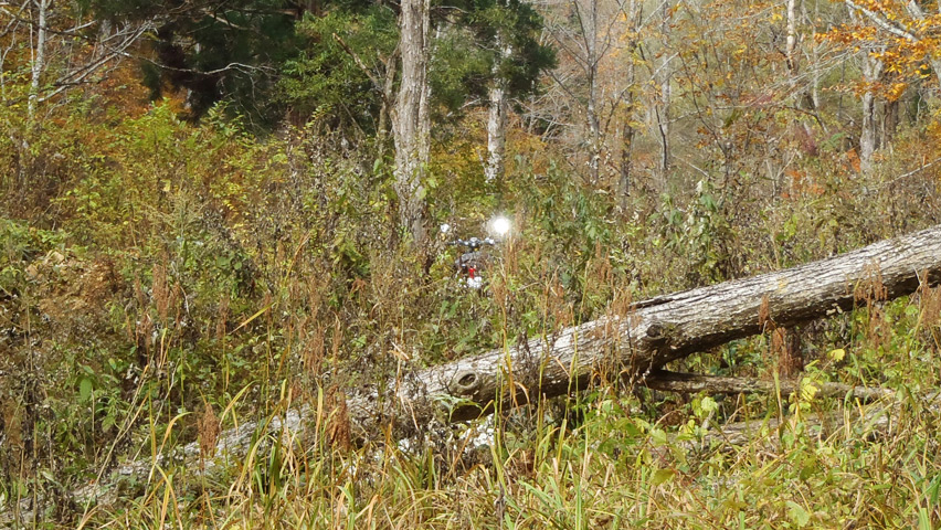 そんなことを考えながら進んでいると、斜面が伐採されて視界が開けている場所があった。そこから下のほうに延びる、いまはもう使われていないと思われる、消えかけた作業道の痕跡があったので、BAJAを降りて少し下ってみると・・・。
