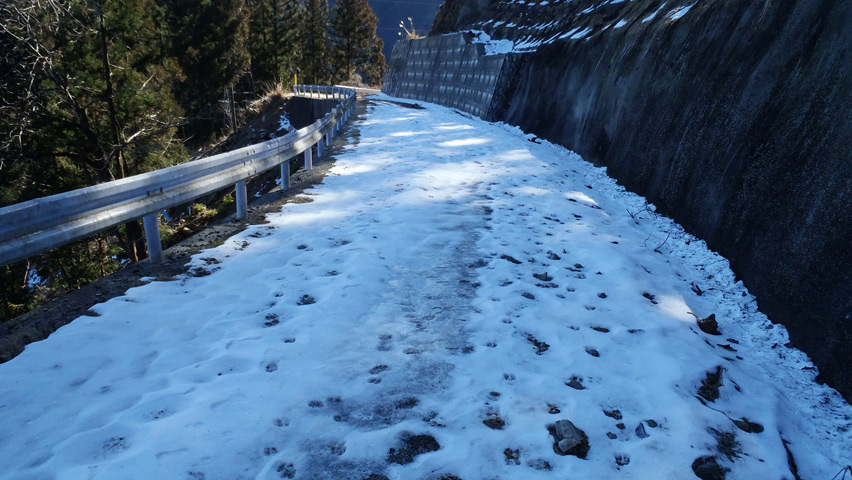 日向はすっかりドライコンディションではあるのだが、ちょっと日影に入る区間はずっとこんな感じになってきた。しかも降雪からだいぶ日が経って、今年の暖かさで解けたり凍ったりを繰り返し、既にツルツルのアイスバーンと化している場所も出てきた模様・・・。