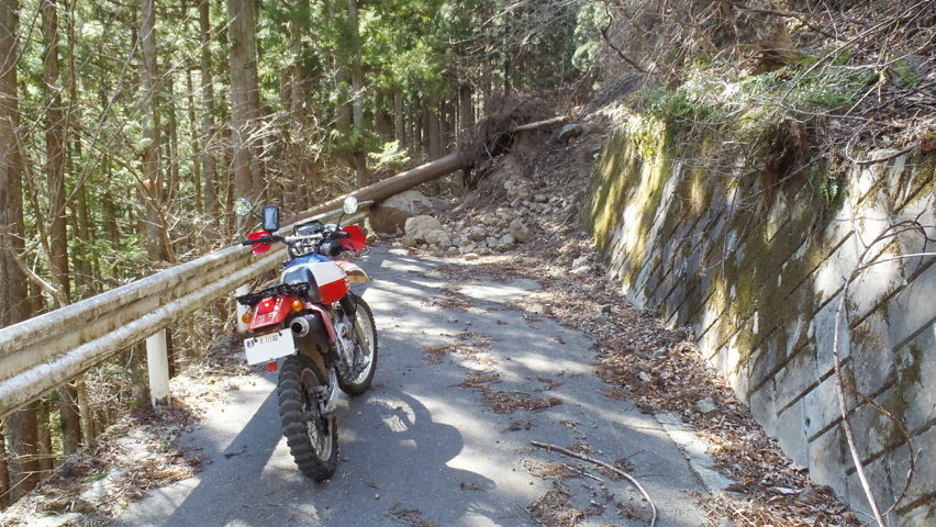 しばらく進むと民家も途切れ、いかにも林道らしい雰囲気になってくるが、それに連れて、こんな感じで路肩の崩れている地点が出てくるようになった。とはいえ、車両の通行の妨げになるようなものではないが。